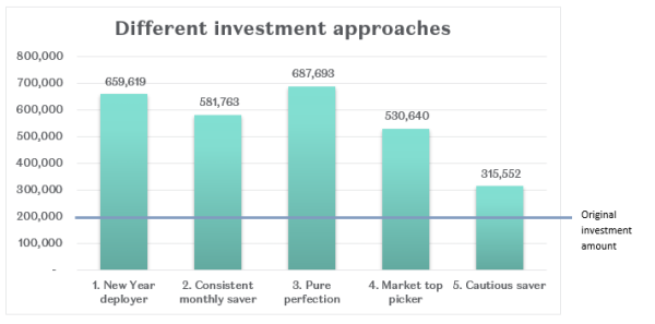 The reason why there are not vast differences in these approaches is because they all share a common trait – once invested, they remained invested. Even badly timed investments were better than none at all.